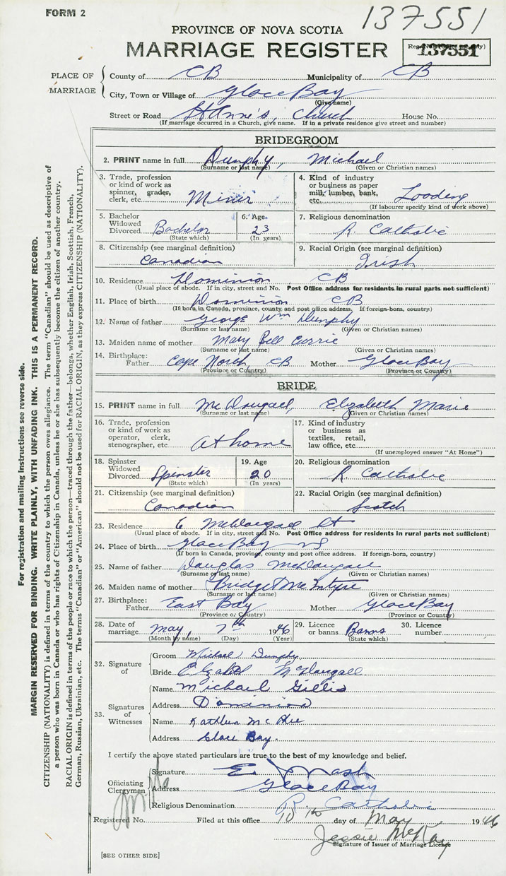 28. Date of marriage May 7 1946 29. By license or banns License 30. License number