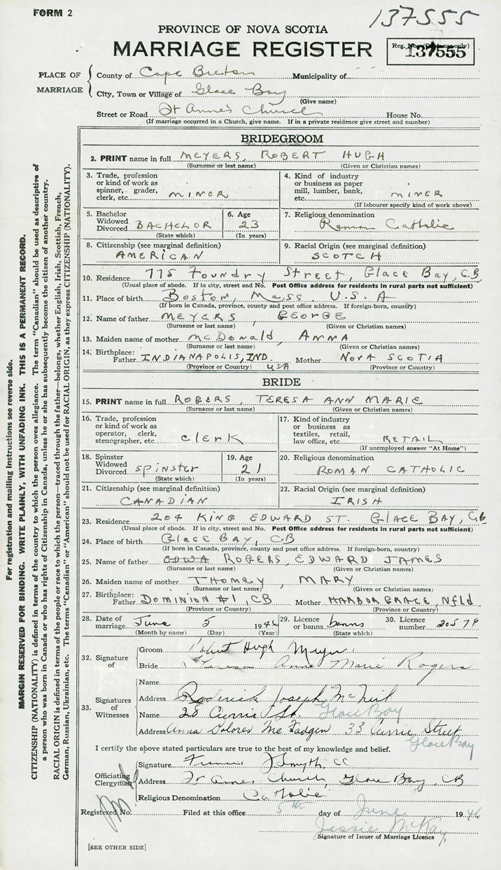 28. Date of marriage June 5 1946 29. By license or banns License 30. License number banns 20579