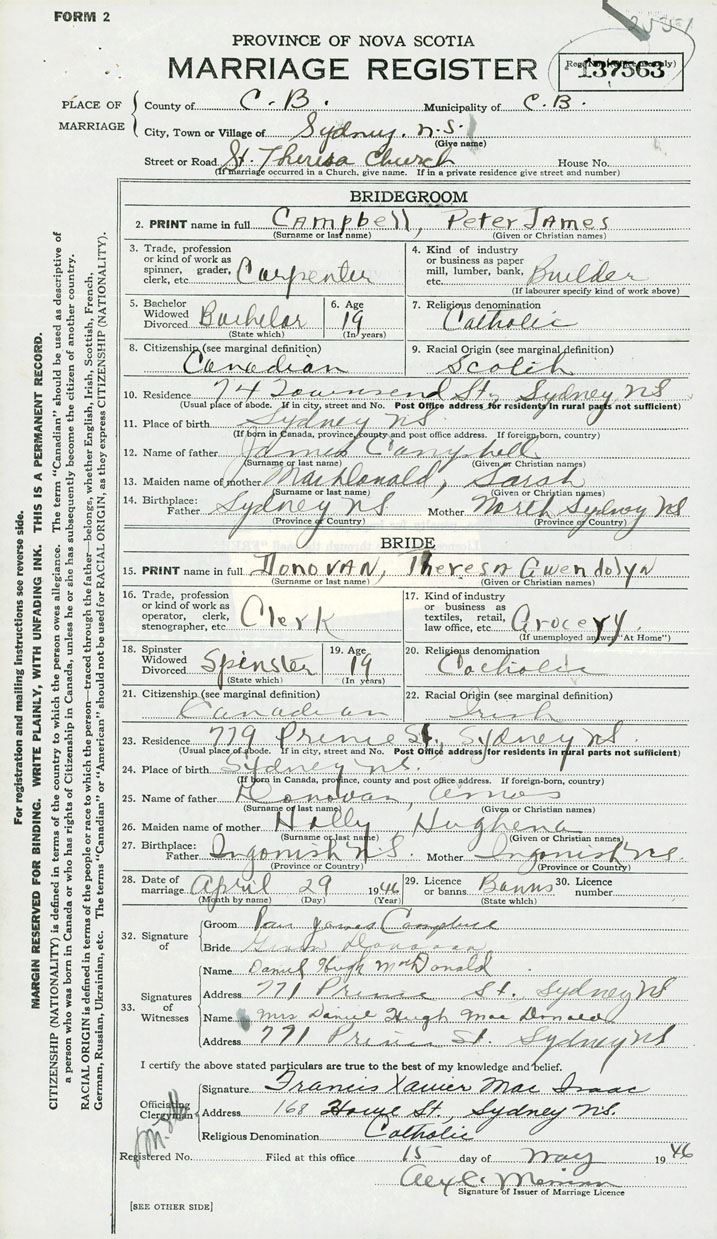 28. Date of marriage April 29 1946 29. By license or banns License 30. License number