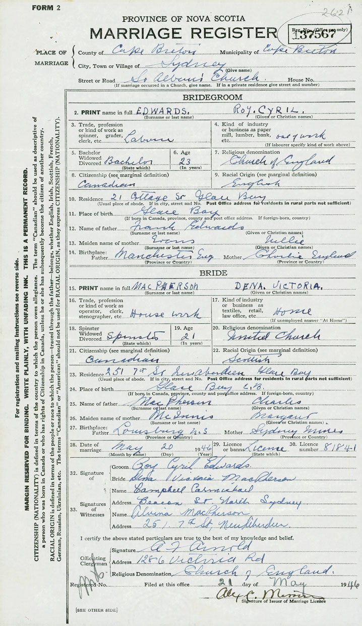 28. Date of marriage May 20 1946 29. By license or banns License 30. License number 81841