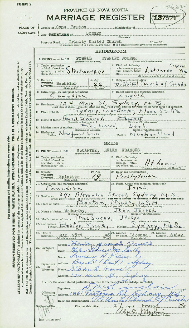 28. Date of marriage May 23 1946 29. By license or banns License 30. License number 81842