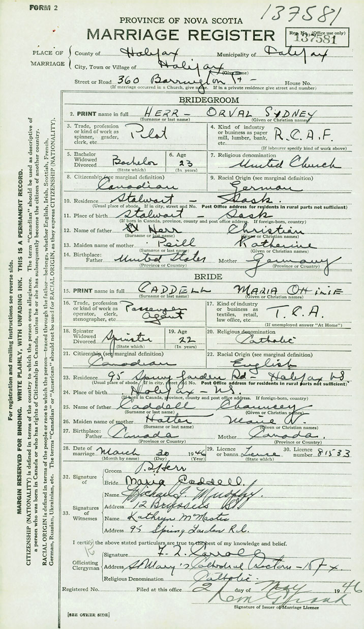 28. Date of marriage March 30 1946 29. By license or banns License 30. License number 81533