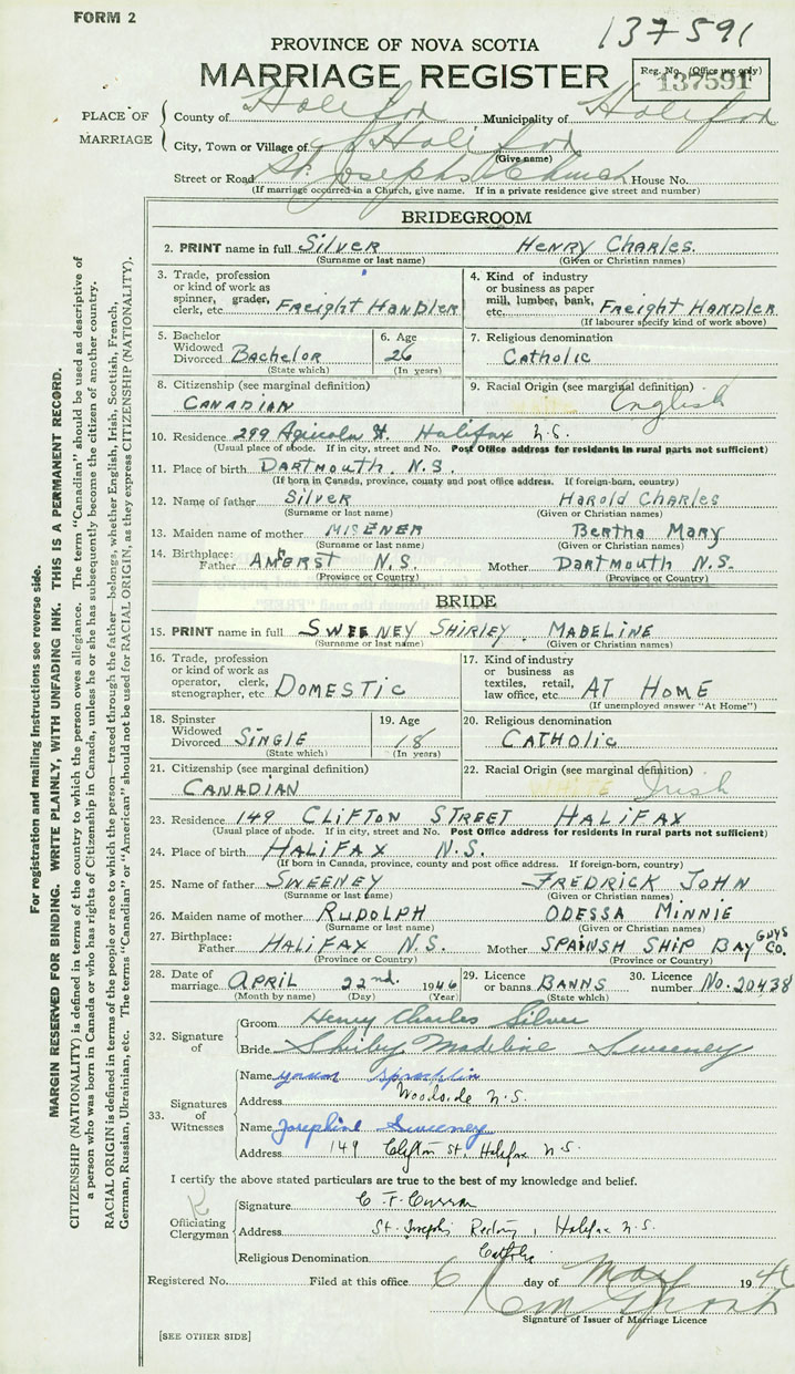 28. Date of marriage April 22 1946 29. By license or banns License 30. License number Banns 20438