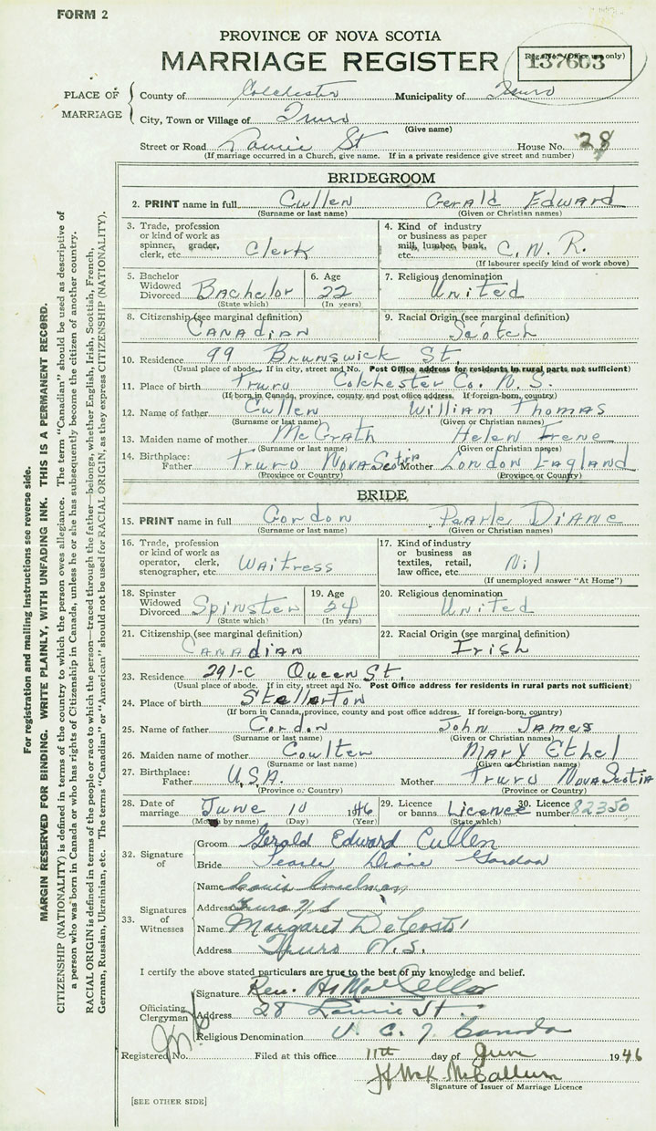 28. Date of marriage June 10 1946 29. By license or banns License 30. License number 82350