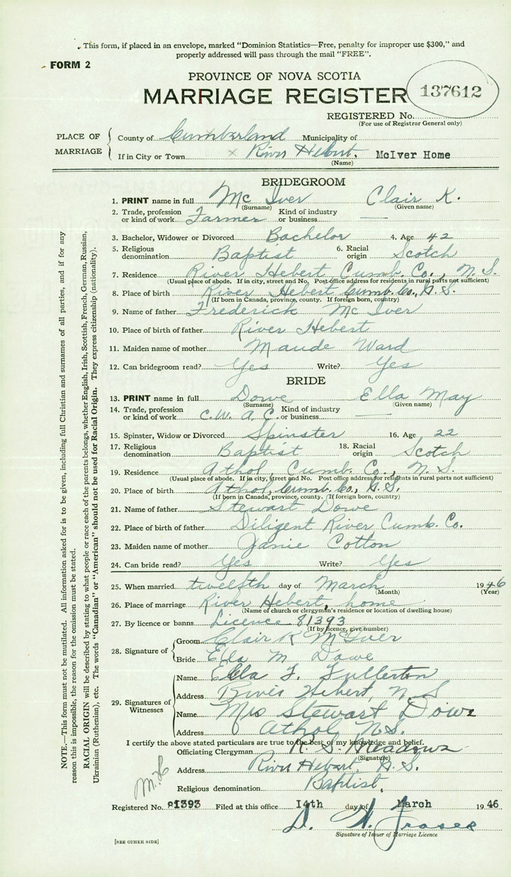 26. Place of marriage McIver home, River Hebert River Hebert, Cumberland County