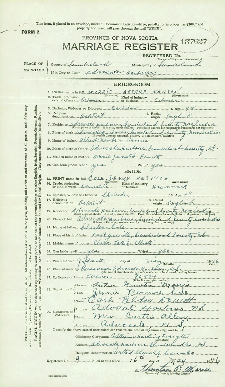 PLACE OF MARRIAGE County of Cumberland in City or Town Advocate Harbour