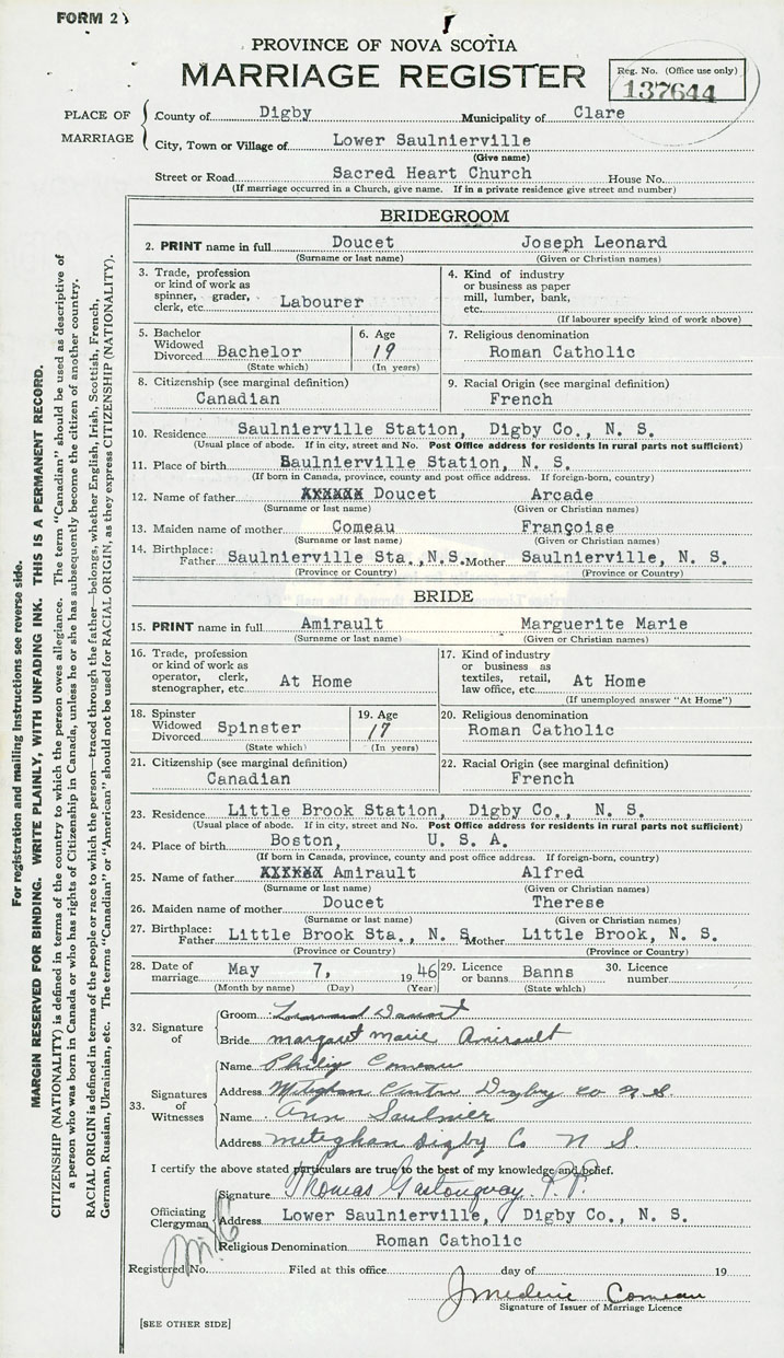 14. Birthplace Father Saulnierville Station, Digby County Mother Saulnierville, Digby County