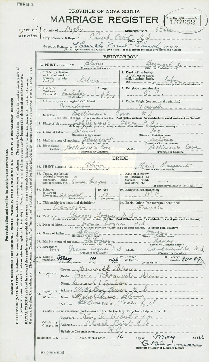 14. Birthplace Father Belliveau's Cove, Digby County Mother Belliveau's Cove, Digby County