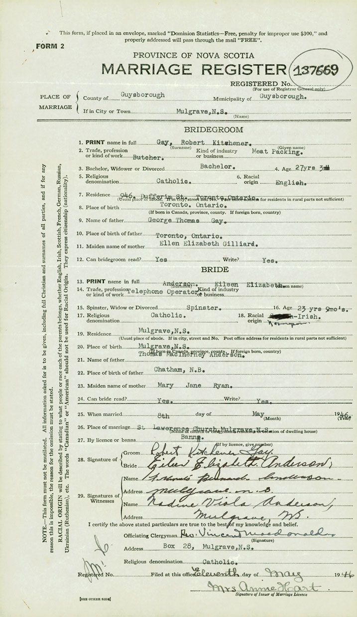 PLACE OF MARRIAGE County of Guysborough in City or Town Mulgrave