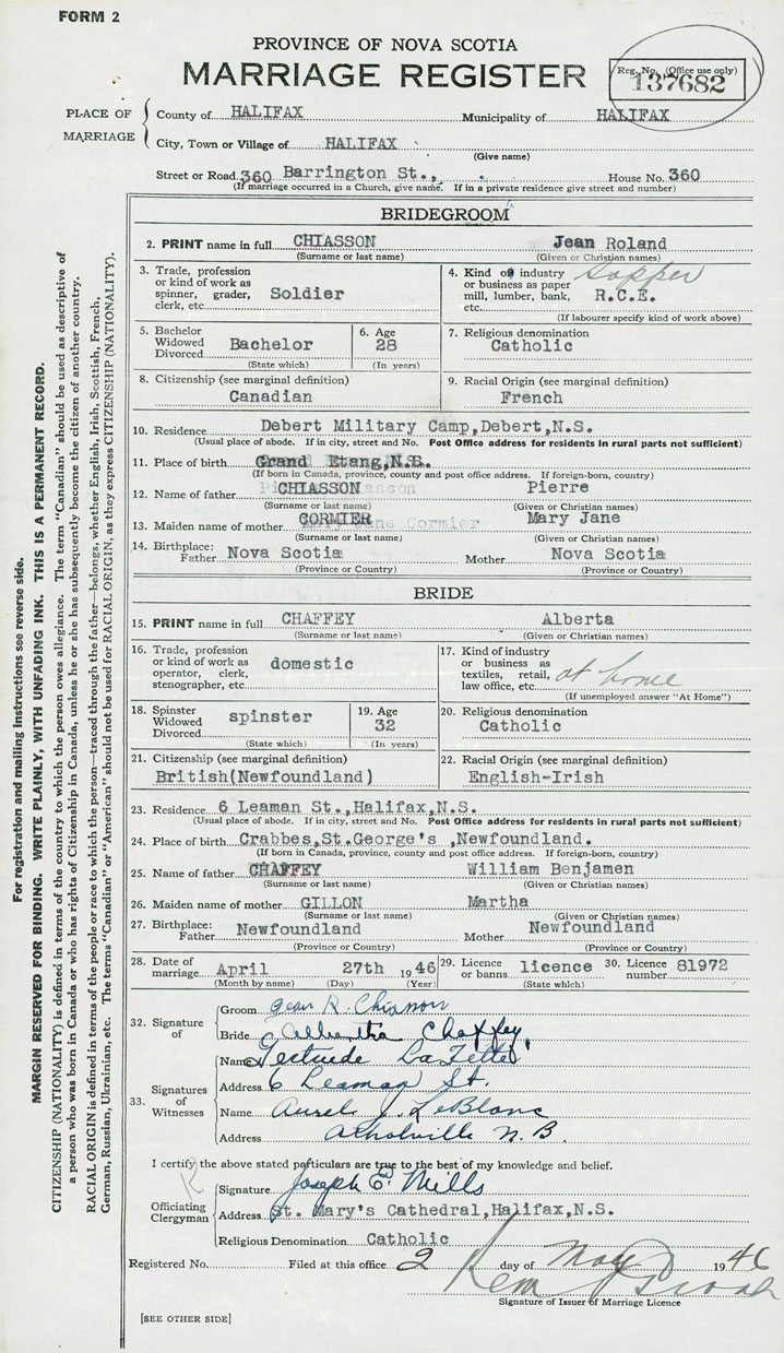 28. Date of marriage April 27 1946 29. By license or banns License 30. License number 81972