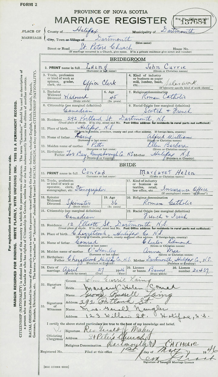 28. Date of marriage April 27 1946 29. By license or banns License 30. License number 20437