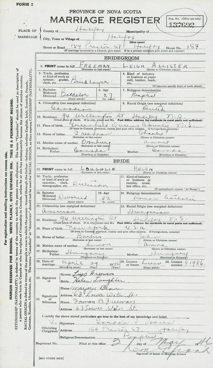 28. Date of marriage April 29 1946 29. By license or banns License 30. License number 81986