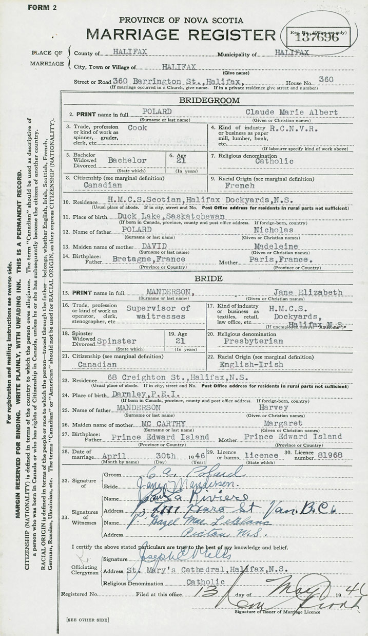 28. Date of marriage April 30 1946 29. By license or banns License 30. License number 81968