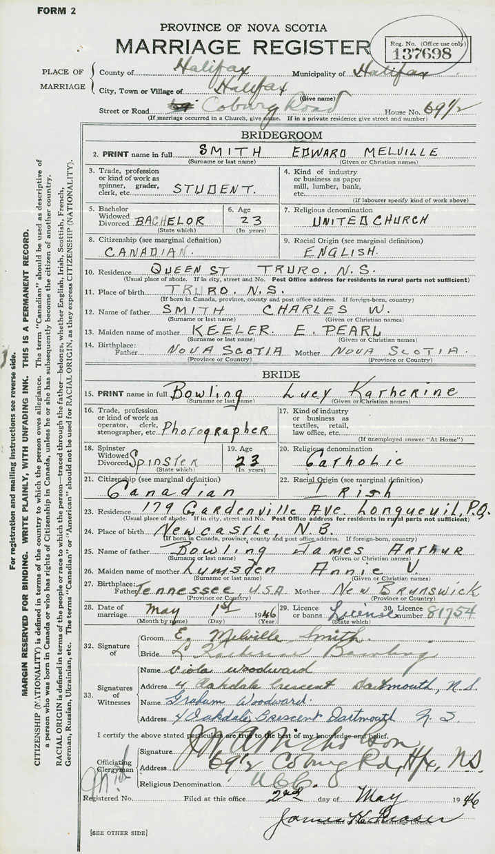 28. Date of marriage May 1 1946 29. By license or banns License 30. License number 81754