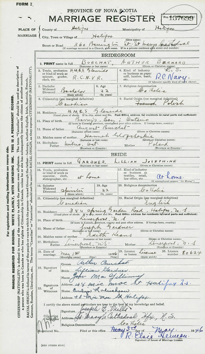 28. Date of marriage May 1 1946 29. By license or banns License 30. License number 80624