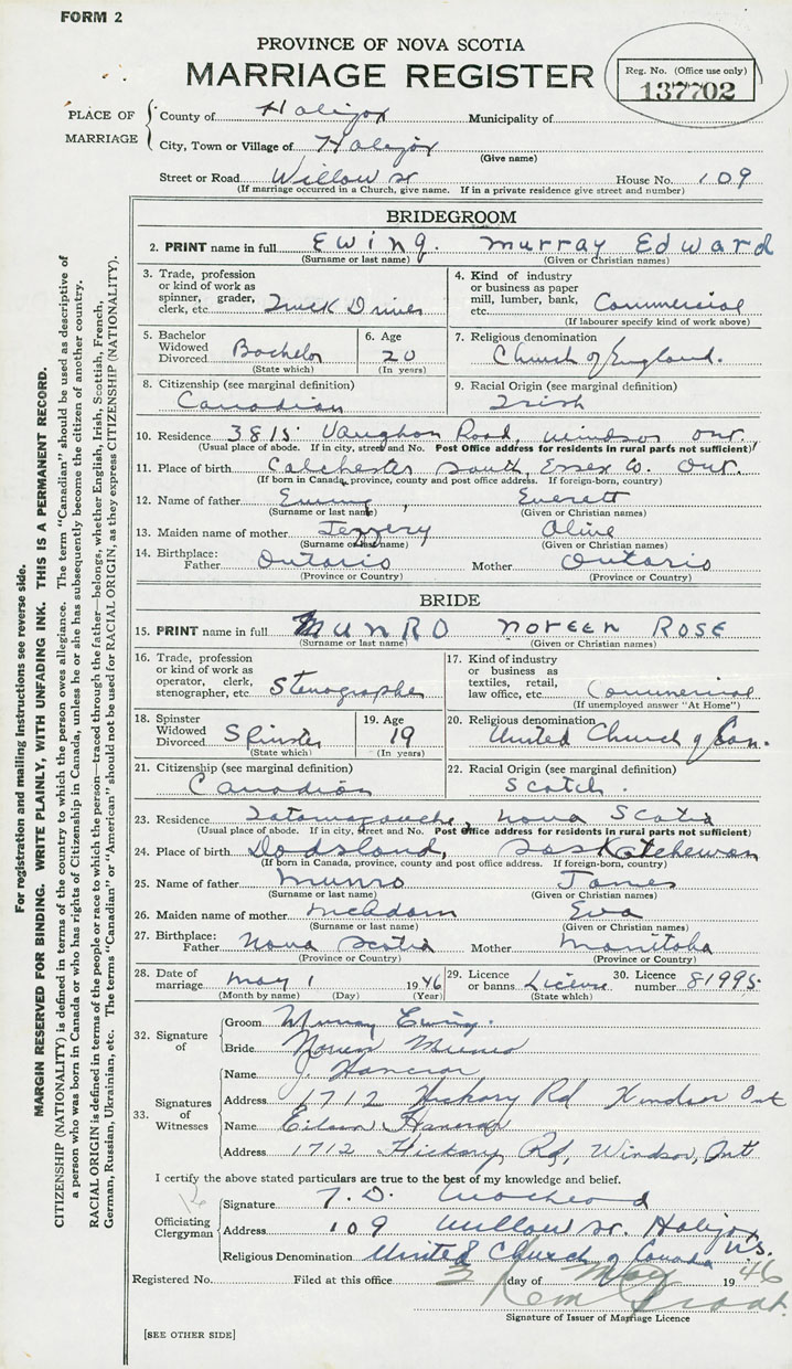 28. Date of marriage May 1 1946 29. By license or banns License 30. License number 81995