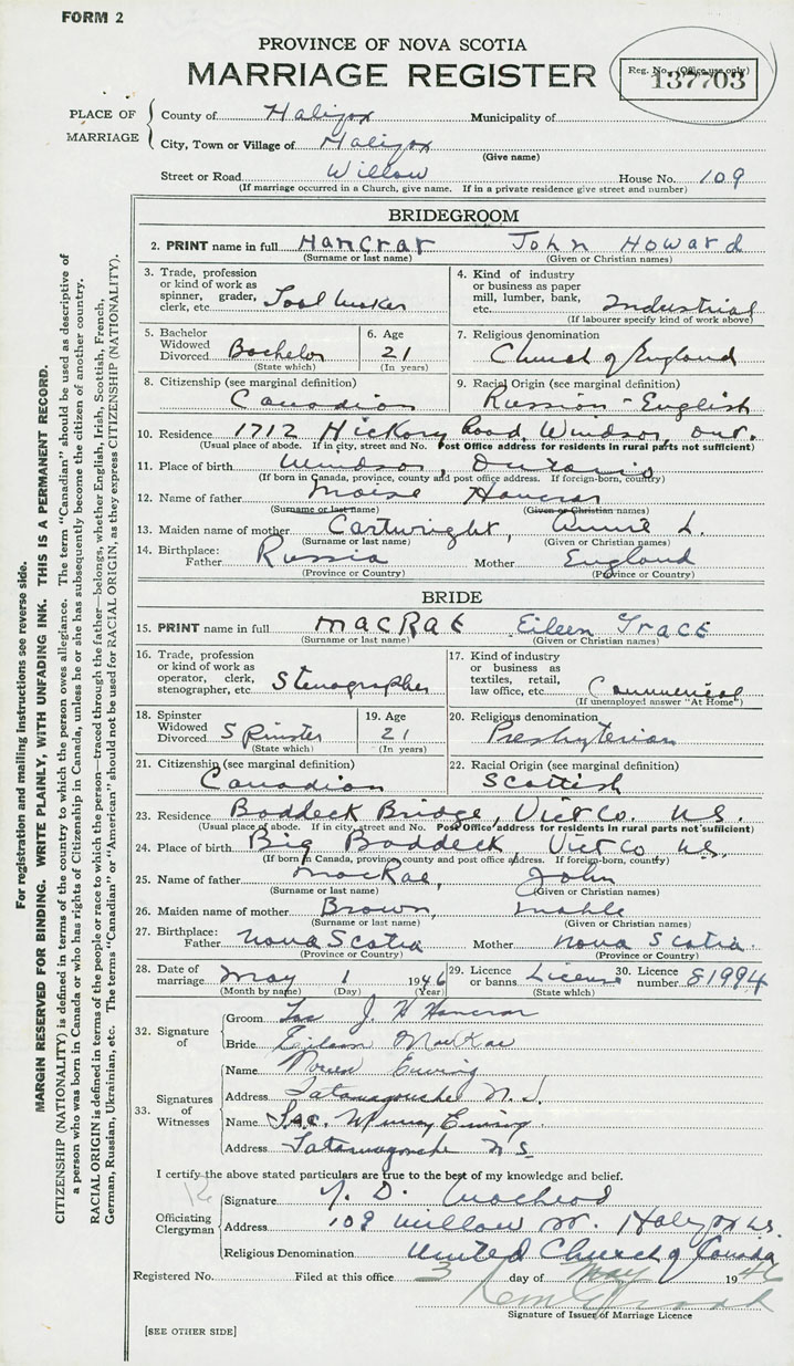 28. Date of marriage May 1 1946 29. By license or banns License 30. License number 81994