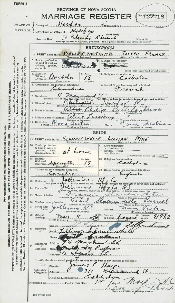 28. Date of marriage May 4 1946 29. By license or banns License 30. License number 81982