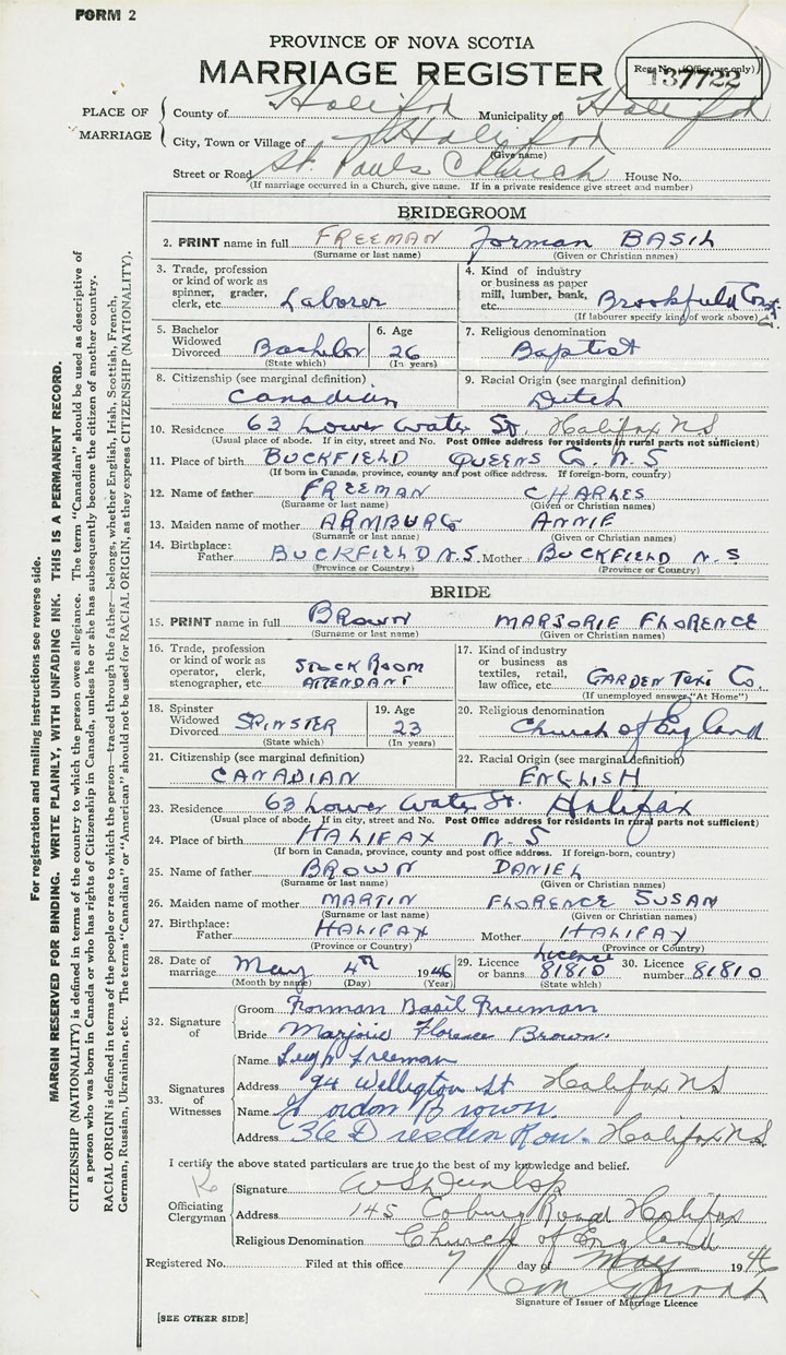 28. Date of marriage May 4 1946 29. By license or banns License 30. License number 81810