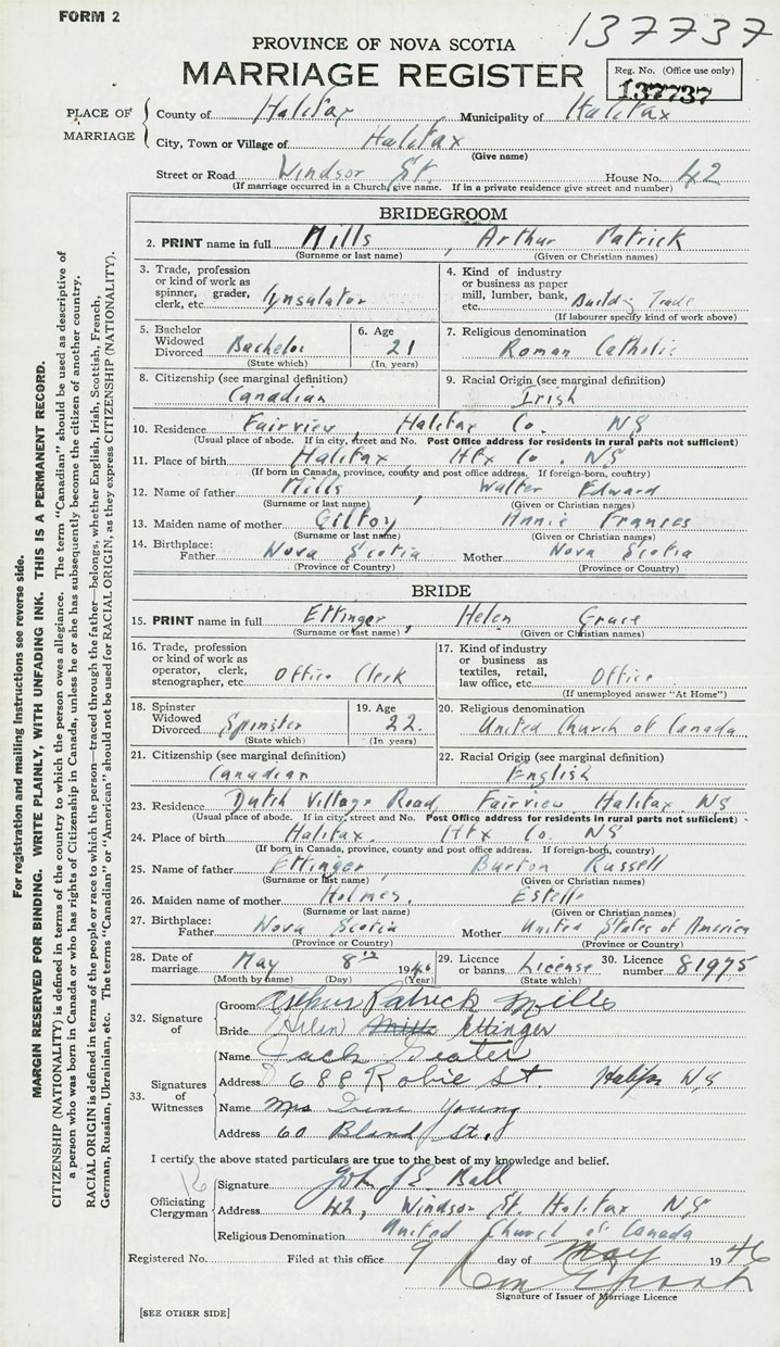 28. Date of marriage May 8 1946 29. By license or banns License 30. License number 81975
