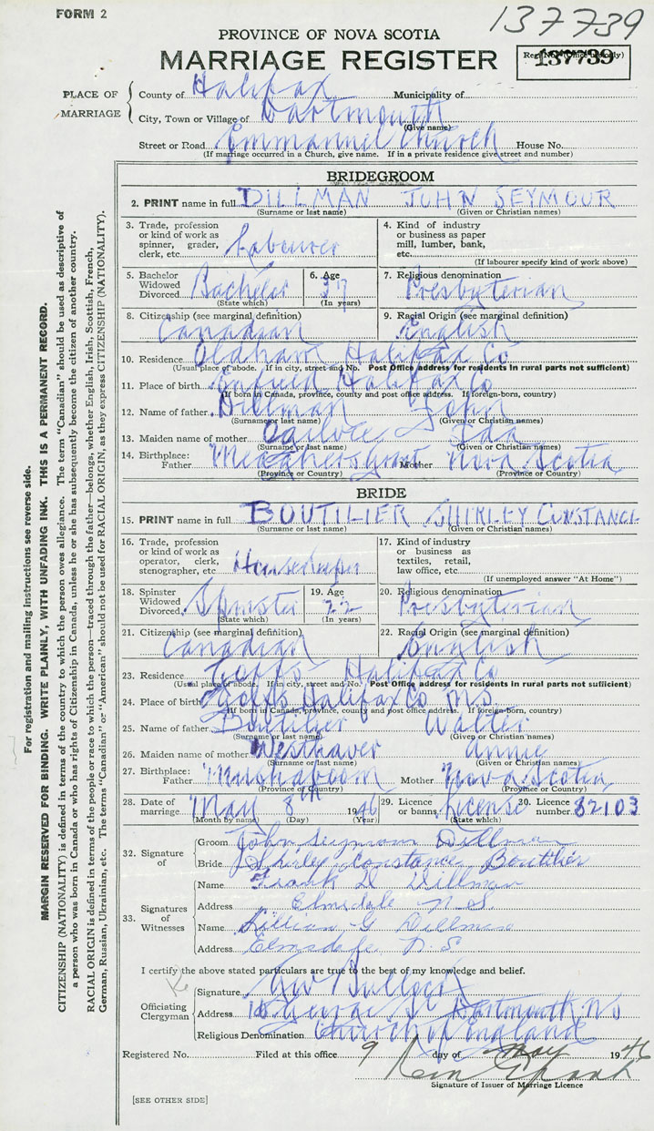 28. Date of marriage May 8 1946 29. By license or banns License 30. License number 82103