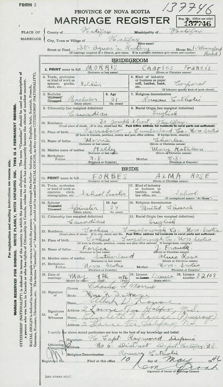 28. Date of marriage May 9 1946 29. By license or banns License 30. License number 82108