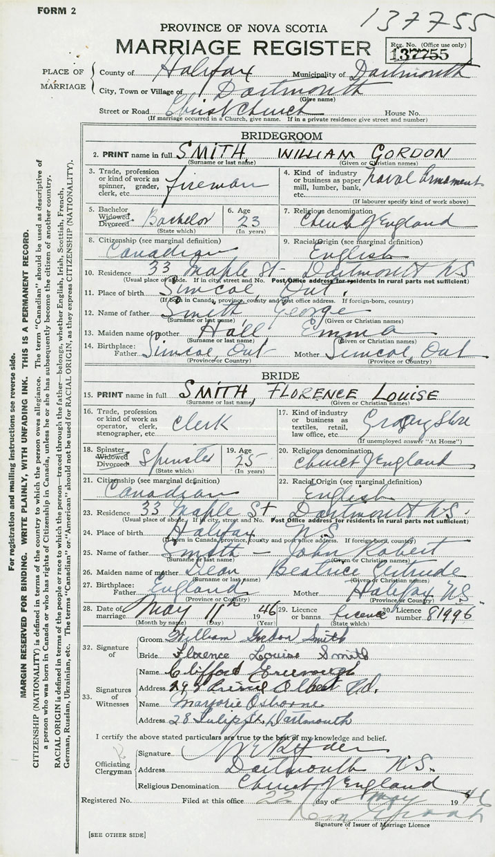 28. Date of marriage May 11 1946 29. By license or banns License 30. License number 81996