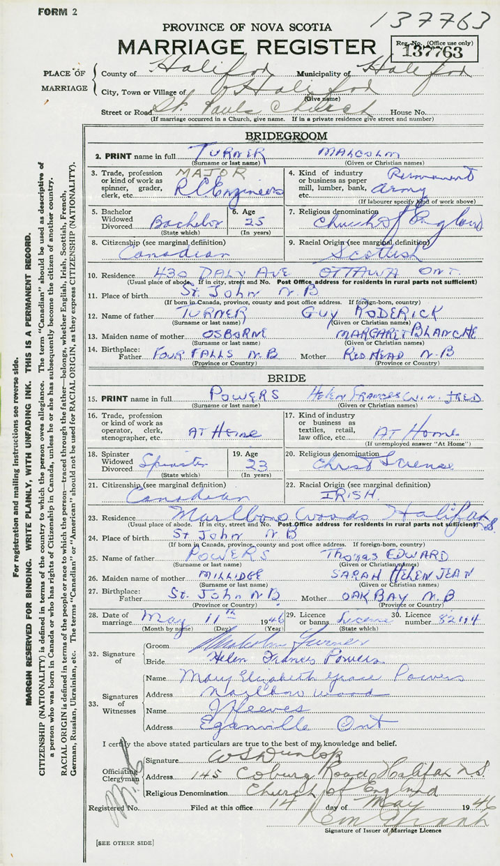 28. Date of marriage May 11 1946 29. By license or banns License 30. License number 82114