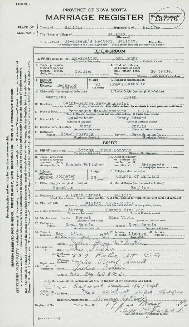 28. Date of marriage May 14 1946 29. By license or banns License 30. License number