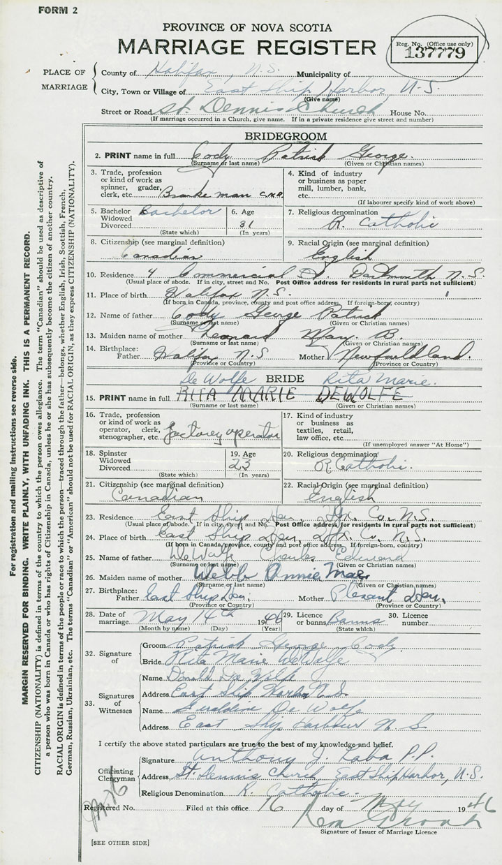 28. Date of marriage May 14 1946 29. By license or banns License 30. License number