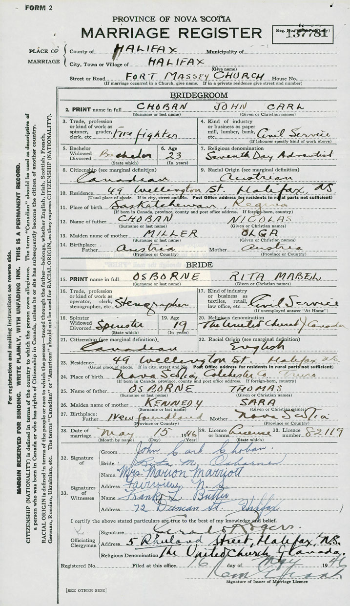28. Date of marriage May 15 1946 29. By license or banns License 30. License number 82119
