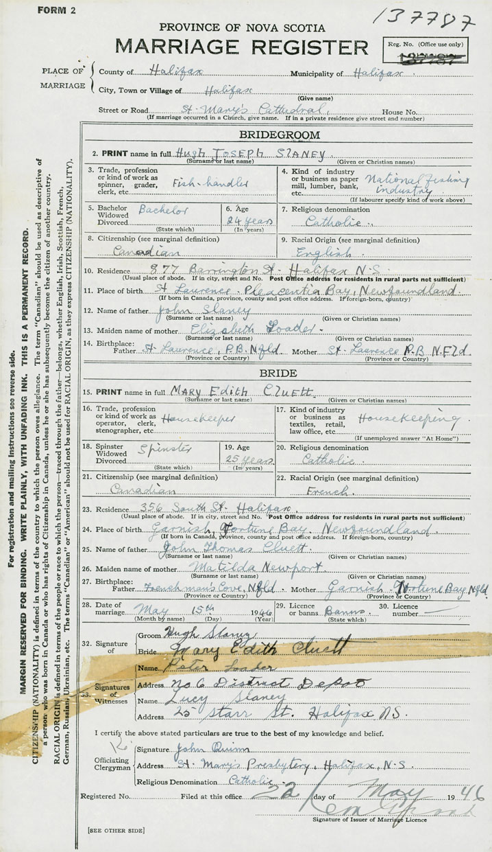28. Date of marriage May 15 1946 29. By license or banns License 30. License number