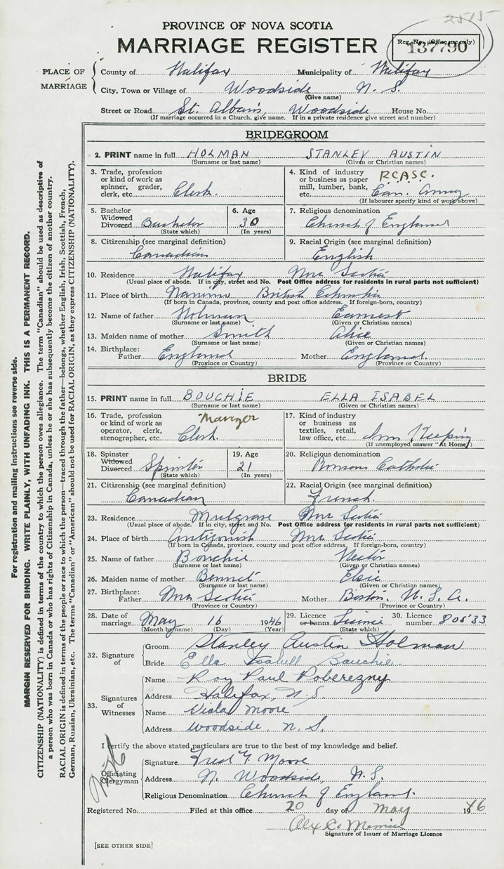 28. Date of marriage May 16 1946 29. By license or banns License 30. License number 80533