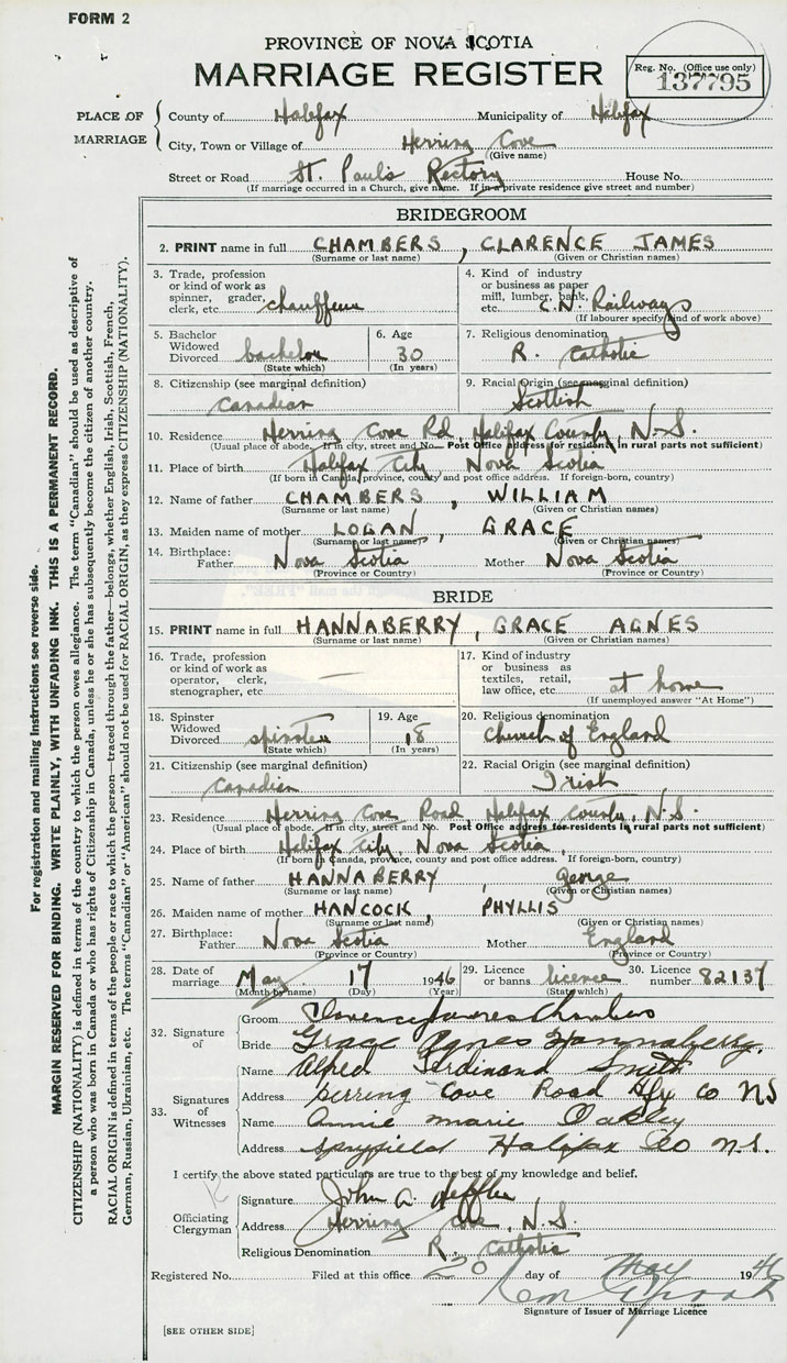 28. Date of marriage May 17 1946 29. By license or banns License 30. License number 82137