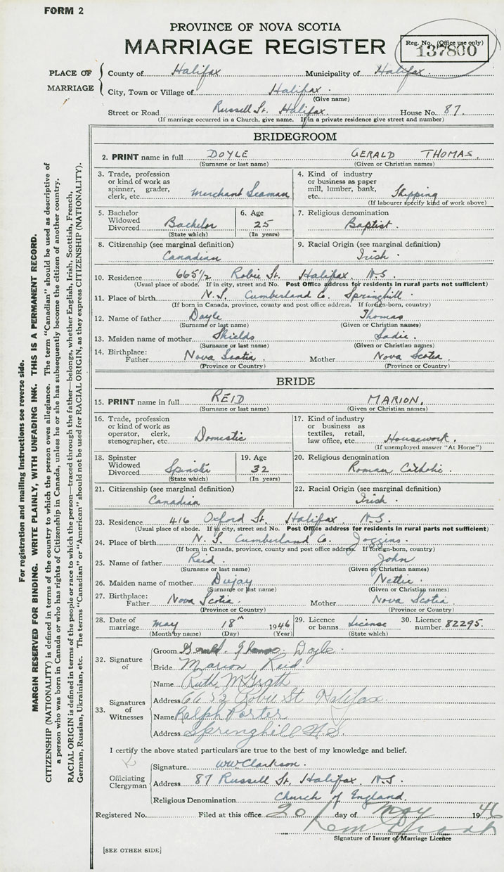 28. Date of marriage May 18 1946 29. By license or banns License 30. License number 82295