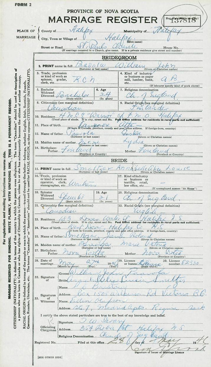 28. Date of marriage May 27 1946 29. By license or banns License 30. License number 82330