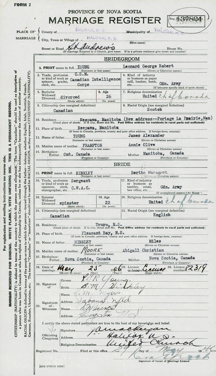 28. Date of marriage May 25 1946 29. By license or banns License 30. License number 82319