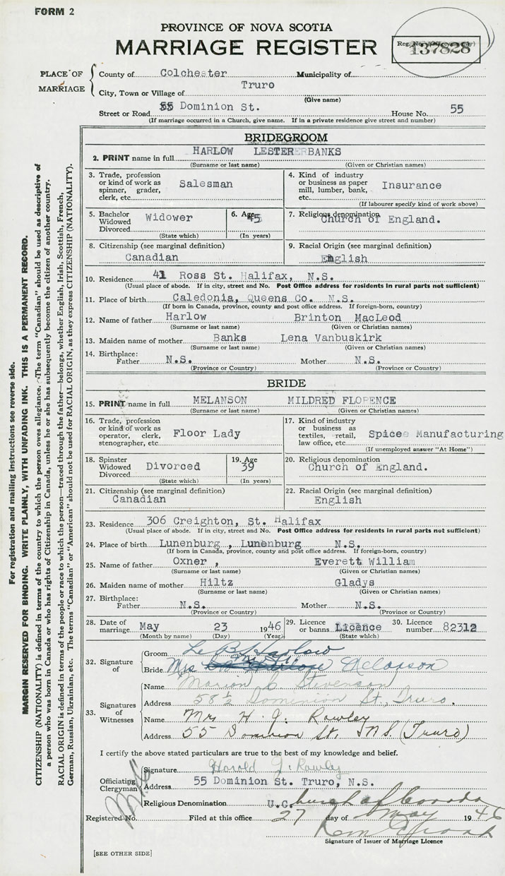 28. Date of marriage May 23 1946 29. By license or banns License 30. License number 82312