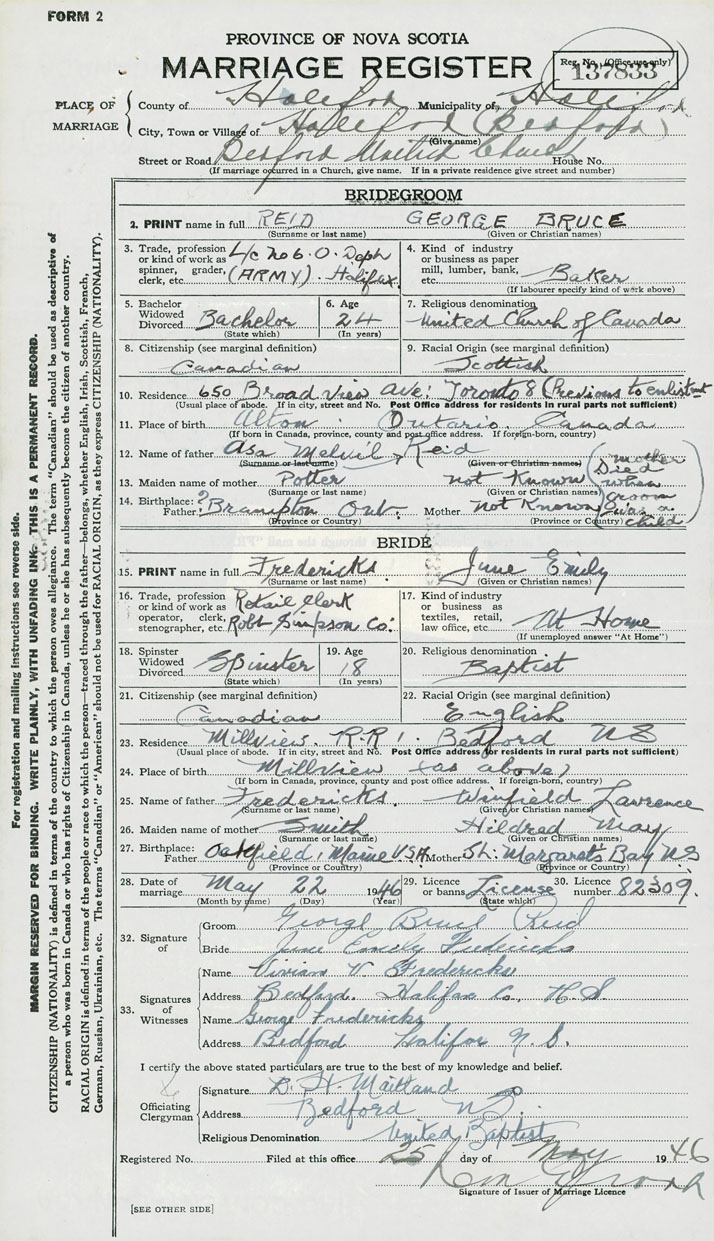 28. Date of marriage May 22 1946 29. By license or banns License 30. License number 82309