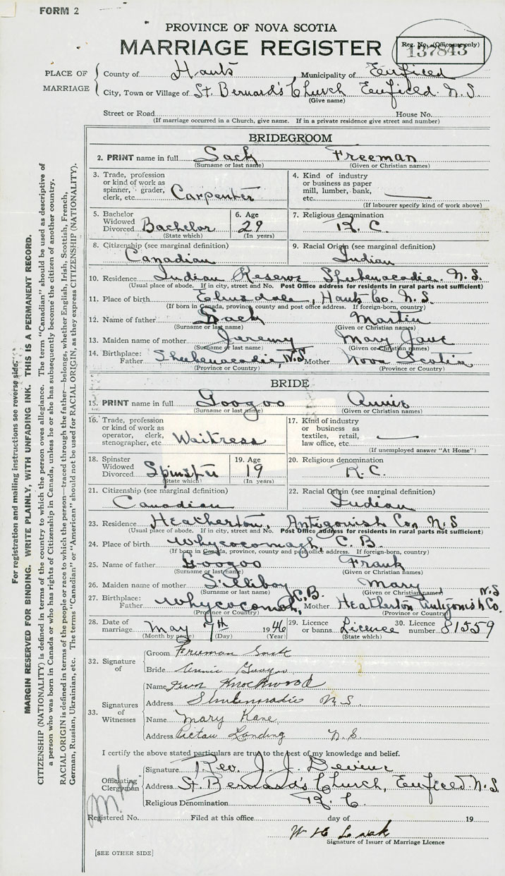 14. Birthplace Father Shubenacadie Mother Nova Scotia