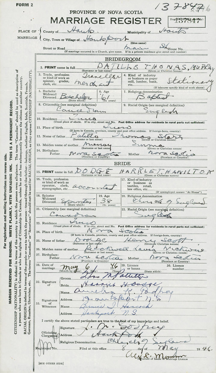 28. Date of marriage May 6 1946 29. By license or banns License 30. License number