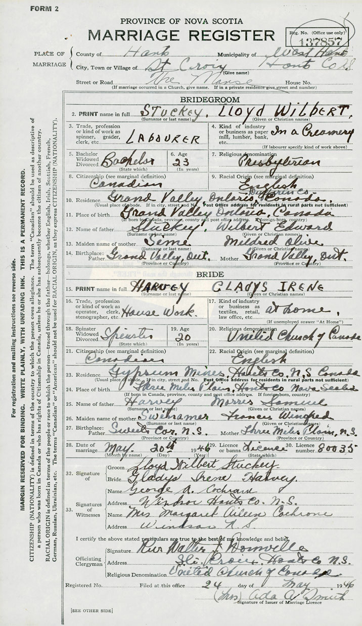 28. Date of marriage May 20 1946 29. By license or banns License 30. License number 80035