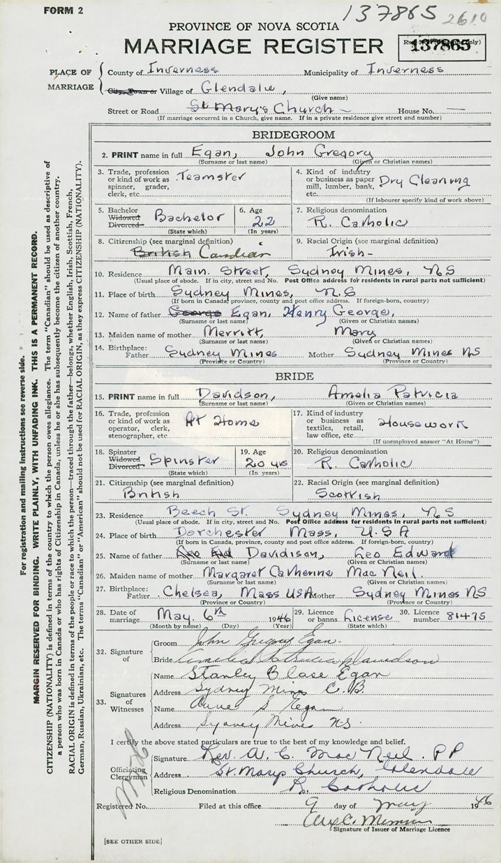 28. Date of marriage May 6 1946 29. By license or banns License 30. License number 81475