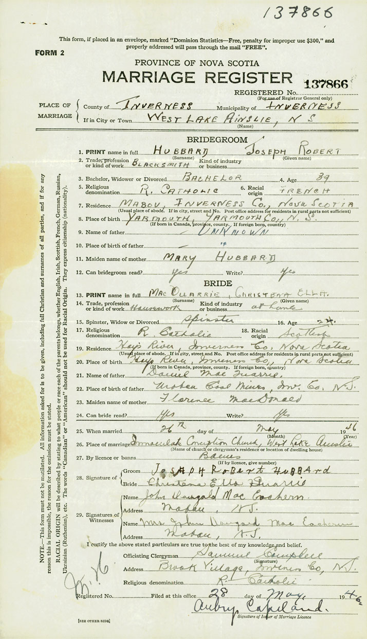 26. Place of marriage Immaculate Conception Church, West Lake Ainslie West Lake Ainslie, Inverness County