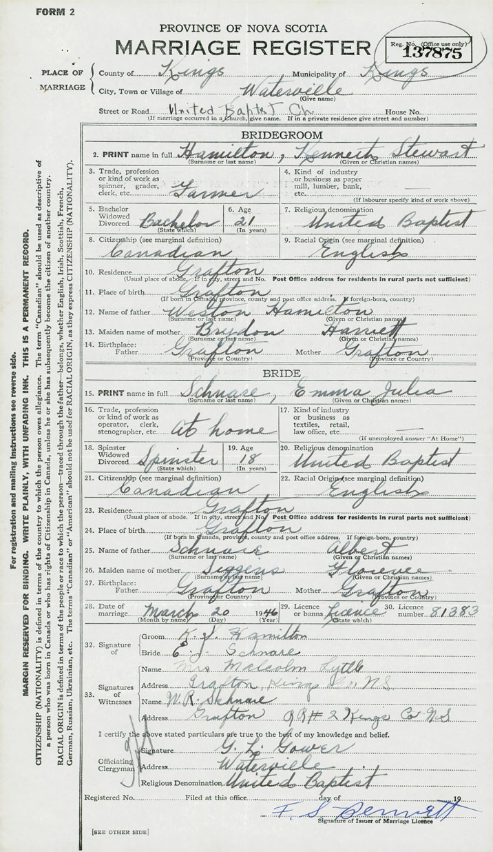 28. Date of marriage March 20 1946 29. By license or banns License 30. License number 81383