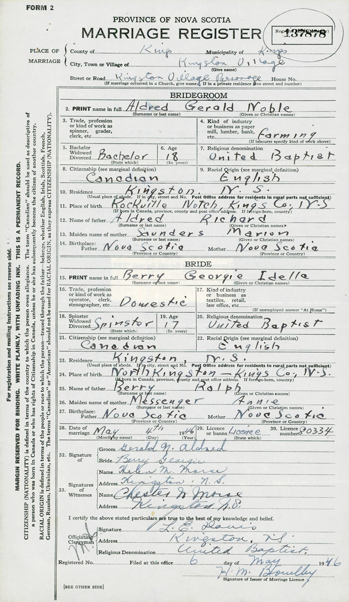 28. Date of marriage May 4 1946 29. By license or banns License 30. License number 80334