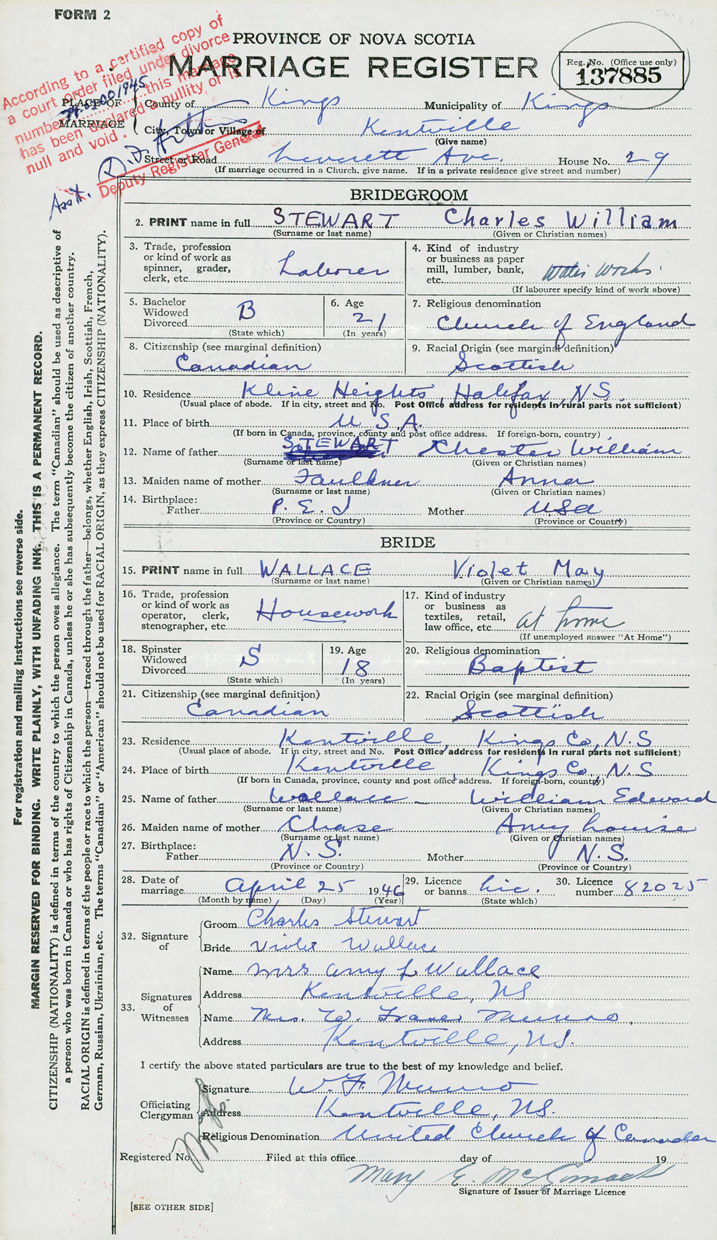 28. Date of marriage April 25 1946 29. By license or banns License 30. License number 82025