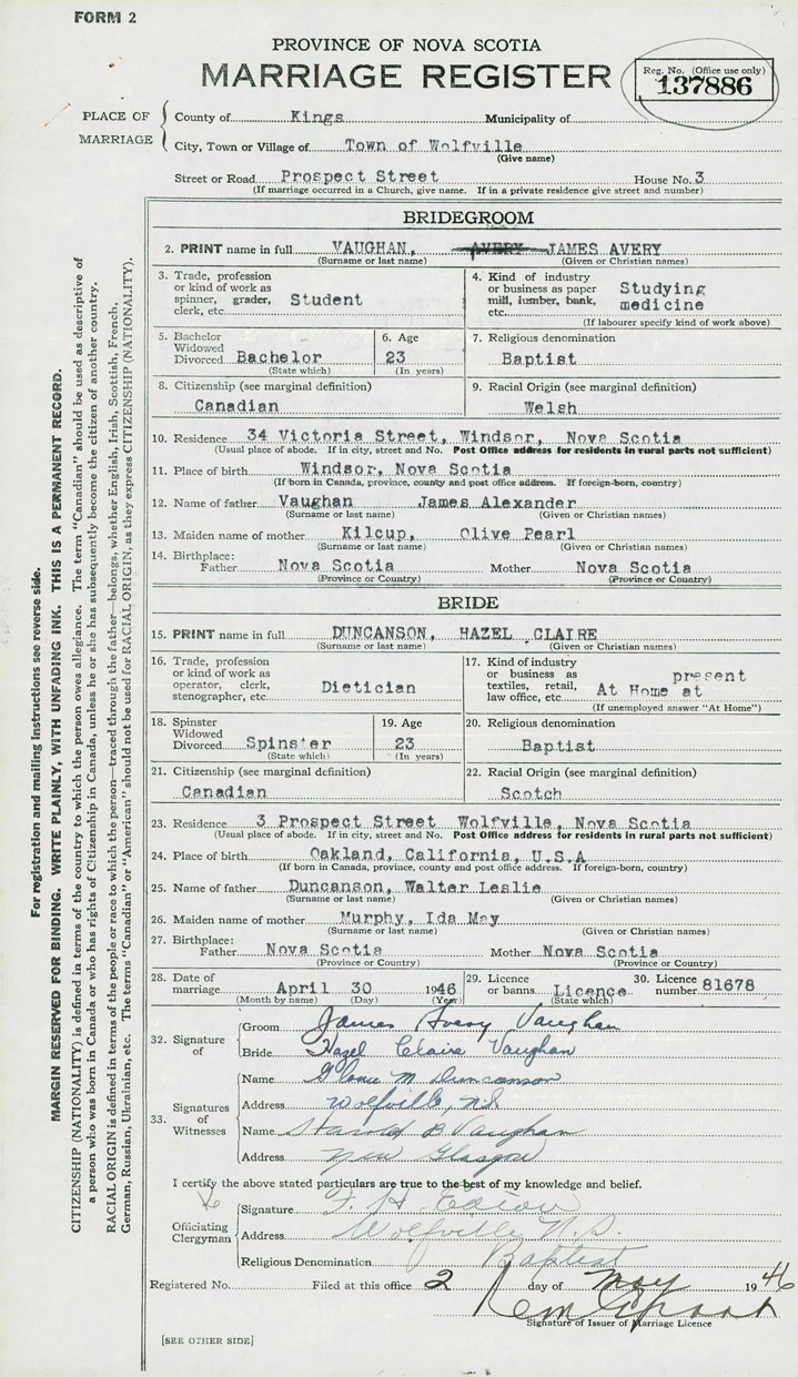 28. Date of marriage April 30 1946 29. By license or banns License 30. License number 81678