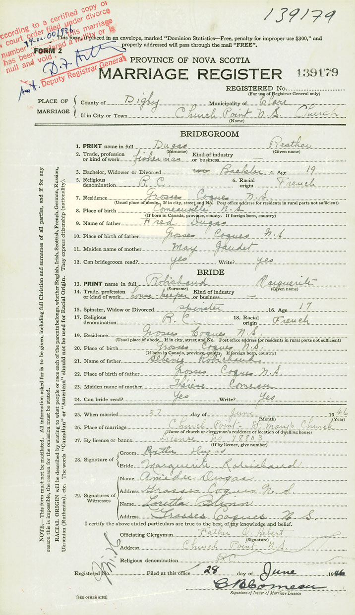 According to a certified copy of the Decree Absolute for Divorce dated 1974-- and filed in the Office of the Registrar General under Divorce number 74-02-001936, it is ordered that the marriage of Resther Dugas and Marguerite Robichaud (Registered under marriage number 1946-139179) be null and void.