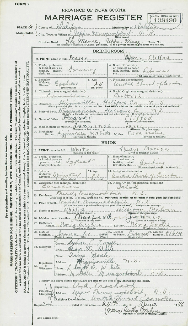28. Date of marriage June 21 1946 29. By license or banns License 30. License number 81614